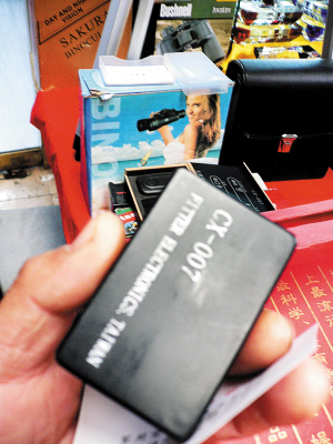 昨天上午,在某洋貨市場內(nèi)六區(qū)一家名為大帆世界精品屋門前的攤位上,一則廣告引起不少客人注目。只見廣告上赫然標(biāo)明銷售“手機(jī)竊聽器”。得知有人詢問竊聽器,這名南方口音、40多歲的攤主顯得很謹(jǐn)慎,不停打量著記者。經(jīng)過幾番交談,攤主看不出什么破綻,才小聲說道:“這東西不是隨便賣的,我就給你講講吧。只要你買任何一張手機(jī)卡插到里面,再將裝置放在你需要竊聽的地方。使用時(shí),你只需要撥打裝置里的手機(jī)號(hào)碼,就可以聽到那個(gè)地方的聲音了。因?yàn)槟闶褂玫氖鞘謾C(jī)竊聽,所以無論多遠(yuǎn)都可以,只要有信號(hào)就行!