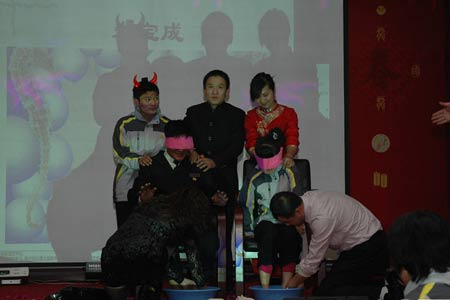 網(wǎng)友在帖子中描述說,幾日前的一個下午,自己在北辰企業(yè)的表彰會上經(jīng)歷了一場感人場面,在文藝演出告一段落、主持人宣布表獎名單后,公司的兩位經(jīng)理上臺為兩位獲獎員工頒獎,獎品是華東五市游和一套豪華床上用品,讓所有嘉賓沒想到的是,主持人神秘地令兩人坐在幕簾后面,感動在場所有人的一幕發(fā)生了:兩位公司經(jīng)理正跪著為朦住雙眼的兩位員工洗腳。
