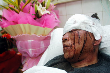 在爆炸中同樣驚魂的還有朱昆峽和老伴阮群。病床上,56歲的朱昆峽頭纏著厚厚的紗布,面部被高溫燙傷,紅腫發(fā)亮。“我們早上剛出門去給大娘過生,他在前面我走在后面!比钊赫f,當(dāng)他們走到14號時,突然發(fā)生了煤氣爆炸,老伴朱昆峽頓時便不見了人影。阮群說,在慌亂的人群中突然發(fā)現(xiàn)一個滿臉是血、雙手抱著頭的人,“我說這個老頭咋沒人管喃,便趕緊上前去攙扶,才發(fā)現(xiàn)居然是自己老伴!比钊赫f,爆炸來得太突然了,很多人根本來不及躲藏就被爆炸產(chǎn)生的高溫和熱浪擊翻在地,受傷者中許多人血流滿面,有的被玻璃擊中頭部和眼睛。