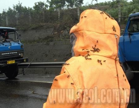 昨日上午,一輛攀枝花車牌的5噸加長大貨車,滿載150余箱(每箱5公斤約2萬余只)蜜蜂,途經(jīng)成渝高速146.5公里處時,后右輪突然飛出車身,貨車側(cè)翻于公路上。車上脫箱而出的上百萬只蜜蜂,瞬時將成渝高速上空變成蜜蜂的海洋。事發(fā)后,交警、高交執(zhí)法隊(duì),以及資中消防官兵10余人聯(lián)手奮戰(zhàn)5個多小時,中午1時30分,成渝高速得以恢復(fù)暢通。
