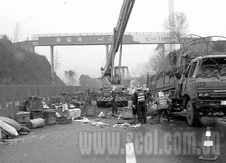“成渝高速資中段出車禍了,鋪天蓋地的蜜蜂滿天飛,好嚇人喲!”昨日上午10時,記者驅(qū)車前往資中。當(dāng)車行至成渝高速148公里處時,被前方長長的車龍堵得無法動彈。直至12時10分,記者才挪到事發(fā)地點(diǎn)。離事發(fā)地點(diǎn)500米處,高速路變成單行道。事故現(xiàn)場,一輛車牌號為川D12695的加長大貨車,已被吊至超車道上。幾名頭戴防蜂帽的工作人員正忙于將貨車拖離現(xiàn)場?砍嚨酪环降孛嫔,堆了數(shù)十個被撞壞了的蜜蜂箱。高速路上空,全是密密麻麻滿天飛舞的蜜蜂群,“嗡嗡”之聲不絕于耳。地面上,躺著至少數(shù)十萬只蜜蜂的尸體。