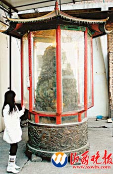 記者在劉學(xué)勤家看到,這塊大玉石陳列在院子里一個(gè)鋼制八角亭內(nèi),亭子四周安裝著鋼化玻璃。大玉石加上底座有3米高,青翠的胎面,雕刻著泰山、華山、恒山、衡山、嵩山五岳山水奇觀。