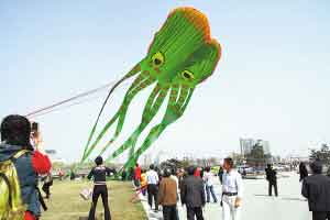 “開(kāi)始放飛!”“章魚”緩緩抬起了頭。第一次試飛,風(fēng)向突轉(zhuǎn),章魚在空中轉(zhuǎn)了個(gè)個(gè)兒,落在了地上,把一個(gè)看熱鬧的老大爺掀了個(gè)跟頭兒。第二次,“章魚”掛在了樹(shù)上。第三次,“章魚”終于升上了天空。
