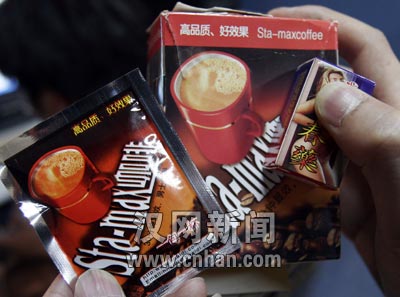 火鳳凰成人保健用品公司的貨架上還擺了一種催情咖啡,沒(méi)有廠名、廠址,方形外包裝與雀巢咖啡十分近似,每盒有8小袋。說(shuō)明稱(chēng)每袋催情咖啡對(duì)入150毫升開(kāi)水沖泡,30分鐘見(jiàn)效。店員稱(chēng)其口感與速溶咖啡類(lèi)似,批發(fā)價(jià)每盒18元。