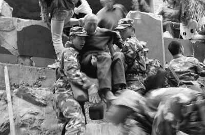 雨越下越大,很多戰(zhàn)士的迷彩服上全是泥水,已經(jīng)完全看不出顏色。幾個(gè)戰(zhàn)士抬著一名受傷的女孩,一路上不停地鼓勵(lì)著:“千萬不要睡著了!”