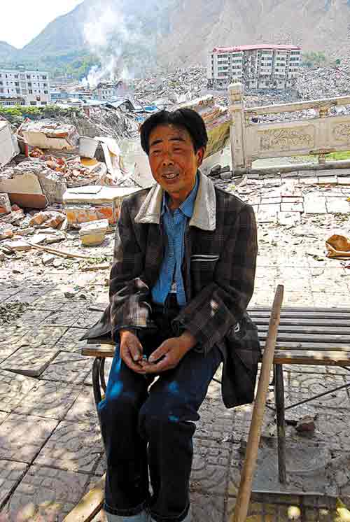 14日下午,當所有救援人員撤退后,北川縣城的街道幾乎空無一人,周圍的廢墟里都是尸體,并靜得令人恐懼。然而,開了一輩子車才剛剛退休一年的周康龍,坐在河邊的凳子上,始終不肯離開。他身旁不遠處的六樓,就是他的家,可現(xiàn)在有一半已在地震中倒塌了。