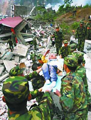 5月13日,武警戰(zhàn)士們從廢墟中營救出了3歲的郎錚,他吃力地舉起傷痕累累的右手,向軍人叔叔們敬了少先隊禮。郎錚的舉動被很多人評價為“地震中最溫情的畫面之一”。