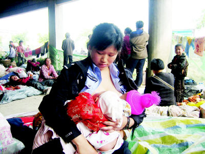 北川縣陳家壩鄉(xiāng)太紅村7組村民楊金玉的丈夫被埋在了廢墟中,由于傷心過度,楊金玉斷了奶,只有兩個月大的兒子便再也沒有吃上奶。北川縣陳家壩鄉(xiāng)平溝村二組村民劉蓉的女兒陳星星剛滿5個月。劉蓉由于受到地震驚嚇,奶水嚴重不足。還有母親受重傷、僅3個月大的嬰兒母瑤瑤……