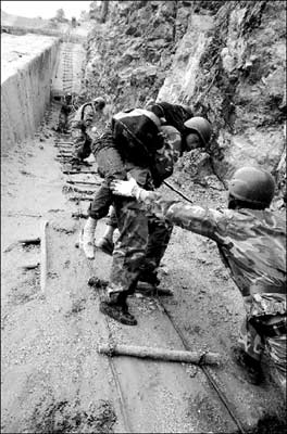 戰(zhàn)士們立即打著手電迎了過去。近了,越來越近了,在手電光中,40多個互相攙扶的人影出現(xiàn)在戰(zhàn)士們面前。戰(zhàn)士們話音未落,人群中哇地響起一片哭聲。戰(zhàn)士們趕忙迎上去將他們扶到洞口,然后每一名受災(zāi)群眾都被一名戰(zhàn)士用保險繩系在腰間,護(hù)送他們一步一步走下軟梯。