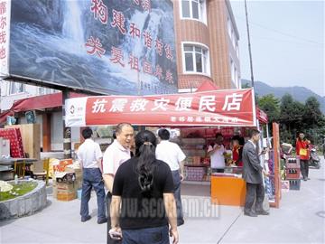 為盡快恢復(fù)受災(zāi)嚴重的阿壩、廣元、綿陽、德陽、成都、雅安等市州的縣(市、區(qū))、鄉(xiāng)鎮(zhèn)的商業(yè)網(wǎng)點,幫助其商場、店鋪、市場以及餐飲等商貿(mào)流通和生活服務(wù)網(wǎng)點正常營業(yè),省商務(wù)廳已出臺如下優(yōu)惠政策:對5月30日前恢復(fù)營業(yè)的商業(yè)網(wǎng)點,給予運雜費補貼;對受災(zāi)嚴重的縣(市、區(qū))、鄉(xiāng)鎮(zhèn)開設(shè)過渡性或臨時性商業(yè)網(wǎng)點的企業(yè),無償提供移動售貨棚,并給予運雜費補貼;對組織送貨到災(zāi)區(qū)城鄉(xiāng)結(jié)合部、鄉(xiāng)(鎮(zhèn))、村銷售的企業(yè),給予運輸車輛一次性補貼,并給予運雜費補貼。(記者 江瑋 實習(xí)生 楊冬 攝影報道)