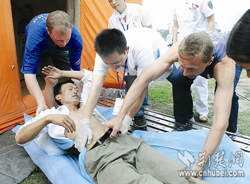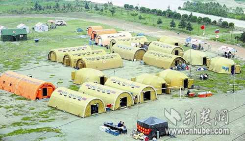 5月24日,汶川大地震后第12天,陽光投射在彭州市職業(yè)中學(xué)操場上的20座巨型充氣帳篷上,不時有高鼻深目的“老外”進進出出。