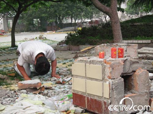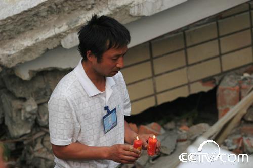 “孩子們,沒(méi)有全部救出你們我很內(nèi)疚,我會(huì)記住你們忌日的,每年的這一天我都會(huì)來(lái)看你們,給你們送學(xué)習(xí)用品。你們生前都很團(tuán)結(jié),在天堂也要相互關(guān)照好,老師每天都在想念著你們!”在北川中學(xué)(新區(qū))的廢墟下,記者看到一名中年男子跪在地上,哭得很悲傷,還向遇難的同學(xué)叩拜。記者跑過(guò)去一看,此人就是北川中學(xué)的校長(zhǎng)劉亞春。他告訴記者,地震后他一直在忙碌搶救學(xué)生的事,沒(méi)有時(shí)間來(lái)看望這些還埋在廢墟下的數(shù)百名學(xué)生。今天他在百忙之中,抽時(shí)間來(lái)看看這些孩子們,他將帶來(lái)的蠟燭點(diǎn)燃后放在廢墟下,雙手合十,默默地祈禱,然后跪在地上給在地震中失去生命的學(xué)生磕了三個(gè)響頭。