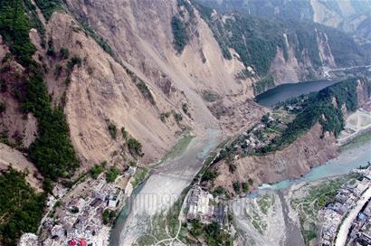 昨日上午9時(shí),記者登上運(yùn)送搶險(xiǎn)物資的直升機(jī),飛機(jī)穿過北川縣城南端的險(xiǎn)要溝壑后,緩緩飛入四處塌方、滑坡的唐家山山谷。透過飛機(jī)的舷窗,遠(yuǎn)遠(yuǎn)地可以看見前下方狹長河堤上有一個(gè)巨型堤壩,堤壩上面的凸出部位依稀可見隨風(fēng)飄揚(yáng)的紅旗!斑@是搶險(xiǎn)部隊(duì)插的,你看上面都有他們的部隊(duì)名稱呢!彪S機(jī)護(hù)送物資的戰(zhàn)士解釋說。