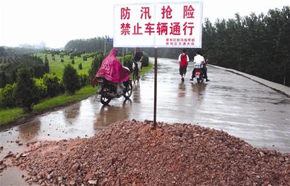 昨日中午,記者在漢江蔡甸永固堤入口處看到,干堤道路已被沙土擋住,豎有一塊“防汛搶險”的警示牌。前行數(shù)百米,至永固堤中段,可見堤頂?shù)乃嗦访嬗写笃,兩根涵管從堤身穿過。經(jīng)測量,塌陷處長15米,寬8米,最大塌陷深度約0.3米。