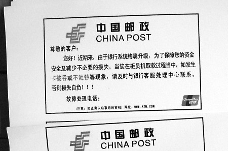 經(jīng)過審訊,班某和甘某很快交代了他們?cè)p騙作案的過程。據(jù)二人交代,他們先用塑料板將ATM機(jī)的出鈔口堵住,并在ATM機(jī)上貼上提示,內(nèi)容是:“尊敬的客戶,當(dāng)您取款不出鈔時(shí),請(qǐng)及時(shí)撥打銀行服務(wù)電話××××、××××與客服中心聯(lián)系,否則后果自負(fù)(上圖)。有粗心的客戶提款不出鈔時(shí),可能會(huì)撥打廣告牌上的服務(wù)電話。