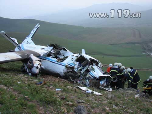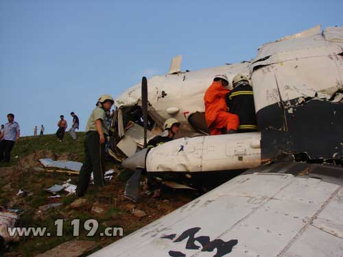 由于失事地點(diǎn)位于山區(qū),消防救援車輛行進(jìn)至距現(xiàn)場10公里處已無法繼續(xù)前進(jìn)。消防官兵迅速攜帶救援裝備徒步行走,山高坡陡,道路極其難行,消防官兵于18時(shí)30分左右趕到飛機(jī)失事地點(diǎn)。救援人員發(fā)現(xiàn)失事飛機(jī)破損嚴(yán)重,右側(cè)發(fā)動機(jī)仍在正常運(yùn)轉(zhuǎn),未發(fā)生火災(zāi)。機(jī)艙外遇難者尸體兩具,機(jī)艙內(nèi)遇難者尸體一具、受傷被困者一名。消防官兵迅速利用剪斷器、擴(kuò)張器等工具將機(jī)體破拆,于18時(shí)50分將被困人員成功救出,隨后又將另一名機(jī)艙內(nèi)遇難者救出。并將獲救人員送上120急救車,但是飛機(jī)的右側(cè)發(fā)動機(jī)仍在高速運(yùn)轉(zhuǎn),外殼已變色。消防官兵僅用兩分鐘時(shí)間關(guān)閉了外殼已發(fā)紅的發(fā)動機(jī),但此時(shí)機(jī)翼竄出火苗,消防官兵利用滅火器和沙土迅速將火災(zāi)撲滅。