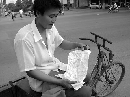 下午5點(diǎn)55分,記者終于見(jiàn)到了馬師傅,他看上去老實(shí)本分,裝扮樸素,鞋和褲子都已經(jīng)破了,蹬著一輛破舊的三輪車(chē),眼睛有些紅腫,在接受民警詢問(wèn)的時(shí)候,還不時(shí)惦記著回家收自己的菜攤。