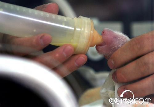 2008年7月7日上午,在中國保護(hù)大熊貓研究中心雅安碧峰峽基地,工作人員正在育嬰箱內(nèi),給大熊貓幗幗7月6日剛出生一對雙胞胎的老大,成功進(jìn)行人工進(jìn)食喂養(yǎng);而雙胞胎的老二目前則由大熊貓幗幗親自給它進(jìn)行母乳喂養(yǎng)。