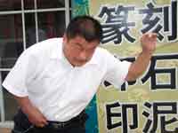 7月8日下午,在李滿朋朋友開的書畫苑里,記者第二次見到李滿朋,這次記者親眼見到了李滿朋的“二指碎瓷”和“單掌開磚”。李滿朋把桌上的一個(gè)瓷煙灰缸摔碎,拿起一小塊瓷片兒,用拇指和食指使勁去捻,只見李滿朋大喝一聲,連捻幾下,那一小塊瓷片兒竟在他手里成了粉末狀,簌簌而下。