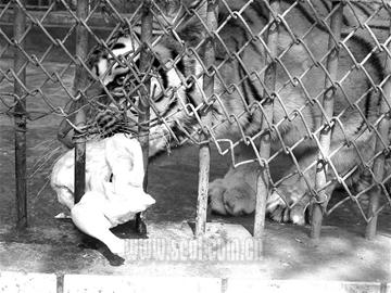 十指連心,動物也不例外;⒄其徸,猶如虎口撥牙。要想成功為“園園”實施剪指甲手術,必須實施麻醉。前日上午10時,技術人員趁“園園”不備,用長竹竿綁上一顆大針頭,將4只陸眠靈麻藥快速推進虎體。15分鐘后,“園園”雙眼時閉時睜伏在地上。不料,30分鐘后,“園園”突然起身,東倒西歪地走了起來!翱磥硭幜刻p,未能完全將它麻醉。”10時38分,技術人員為“園園”補了一支麻藥,體重約150公斤的東北虎,兩腿一軟倒在地上再也爬不起來了。2名工作人員抓住時機,快速將“園園”的右腿拖出鐵欄外,并用繩索牢牢捆綁住虎掌,用鋼絲鉗將虎爪因定。只聽一陣“嘩!嘩!嘩”的拉鋸聲,一名工作人員就像鋸鋼管一樣,奮力朝著虎爪的第二只指甲猛鋸。“嗡!嗡!”就在工作人員即將鋸掉首枚虎爪時,劇烈的疼痛感將休眠中的“園園”痛醒,連續(xù)發(fā)出兩聲怒吼的同時,全身一陣猛抖,欲掙脫束縛拖回被綁的右掌。然而,5支麻藥的藥效已使此時的東北虎有心無力,徒勞一陣后進入夢鄉(xiāng)。