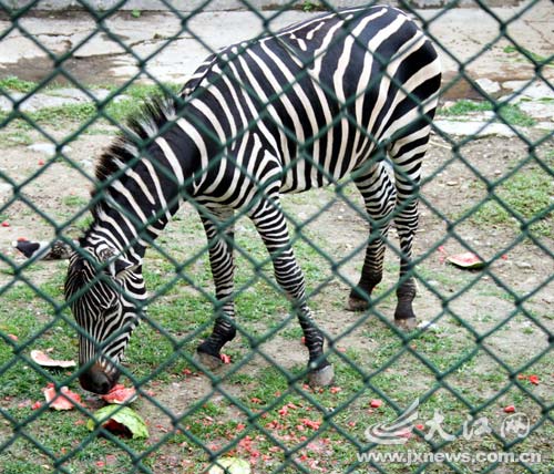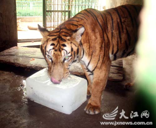 16日,記者在南昌市動物園看到,老虎正抱著大冰塊睡著大覺!疤鞖馓珶幔覀兠刻於家慕600公斤冰塊為5只老虎降溫。3只大象每餐也要吃掉約75公斤西瓜!憋曫B(yǎng)員告訴記者。記者看到,河馬喜歡泡在水池里,熊貓則躲在空調(diào)房里愜意地打著盹,大象、斑馬忙著啃西瓜。