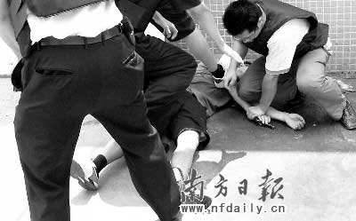 在對抓獲的兩名犯罪嫌疑人審訊期間,聯(lián)合專案組掌握到該團伙另一名成員“阿文”藏匿在松崗街道某旅店。11時許,“阿文”察覺遭到警方圍捕,在松環(huán)路美食街附近先后持槍劫持兩名男子和一名女子作為人質(zhì)。聯(lián)合專案組民警立即組織疏散群眾,同時與嫌疑人周旋!澳莻歹徒很囂張,不斷地叫喊,來了近百名警察把他圍了起來,場面很緊張,我都叫我老婆趕緊離開!蹦繐粽哧P(guān)先生心有余悸地說。