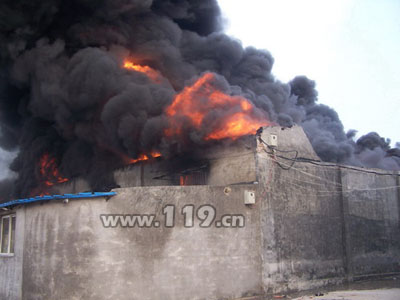 到達火災現(xiàn)場后,經(jīng)過指揮員火情偵察,發(fā)現(xiàn)發(fā)生火災的為一座儲存油漆等化工危險品的簡易倉庫,火勢處于迅猛發(fā)展階段,并迅速向東面相鄰的山東電視臺存放布景道具的倉庫蔓延(里面存放著價值50萬元左右物資),情況十分危急,中隊指揮員立即兵分兩路,15噸水罐車出單干線兩槍操,一支槍在南側(cè)倉庫上方壓制化工品倉庫內(nèi)部火勢,另一支槍控制住正向東蔓延的火勢,防止引起更大面積的火災。中隊斯太爾泡沫水罐于物資倉庫北側(cè),出單干線一支槍壓制火勢防止火勢向北側(cè)民用房蔓延。