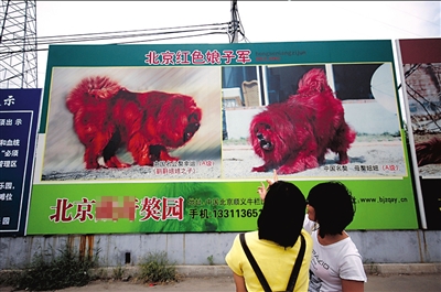 這幅廣告長約兩米,“北京紅色娘子軍”的字樣下,是兩張藏獒照片,毛色粽紅油亮。據(jù)了解,這是順義一家獒園的廣告。“廣告講噱頭,但也不能將藏獒比成紅色娘子軍啊!备浇用窀吲空f,這樣的廣告方式過了頭,看了心里特別不舒服。