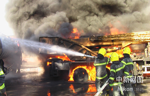 一中隊于09時34分到達火災現(xiàn)場后經(jīng)觀察及詢問知情人,停車場院內(nèi)1輛載重28.58噸凝淅油油罐車和3輛吊車著火,鄰近的另外3輛吊車、20余輛貨車及汽車修理鋪受到威脅,油罐隨時發(fā)生爆炸,如不及時控制火勢,造成的后果將不堪設(shè)想。