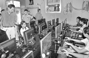 昨天上午10點,督查組一行來到位于中華路156號的“滿江紅網絡”進行突擊檢查!澳芸匆幌履愕纳矸葑C嗎?”一進門督查人員亮明了身份。突然一位工作人員立刻跑到了里面,緊接著從專區(qū)的一個門內呼啦啦一下跑出了四五十名學生模樣、神色慌張的年輕人。督查人員趕緊攔住一位正提著書包往外跑的學生,“你是來上網的嗎?”“不是,我是跟同學來這兒看別人玩的!睂W生吞吞吐吐。督查人員進入這個專區(qū),只見配有幾十臺機器的專區(qū)只剩了兩個人,但是卻拿不出身份證!霸谶@兒上網是不用身份證的!逼渲幸恍』镒诱f。