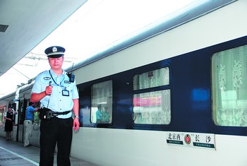 圖為民警手執(zhí)“摩爾”探測儀在長沙火車站一站臺對進京列車查危搜爆。朱紅梅 攝
