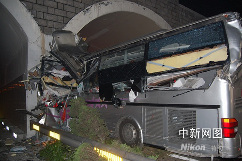 事故發(fā)生后,接到報警的麗水特勤中隊立即出動一輛搶險救援車、一輛水罐消防車和16名消防官兵火速趕赴現(xiàn)場進行救援。到達現(xiàn)場后消防戰(zhàn)士們發(fā)現(xiàn),出事的是一輛奔馳的雙層客車,客車幾乎成為一堆廢鐵,車身嚴重損壞,右半邊竟然被撞得凹陷到只剩二分之一,車前的擋鳳玻璃飛到距車身一百米以外的地方,由此可以想象當時的車速有多快。事故現(xiàn)場到處散落著玻璃碎片,車上的零件隨處可見,汽油味,血腥味,混雜在一起。