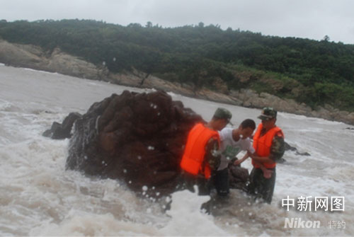 中新網(wǎng)溫州9月13日電(記者 江耘 通訊員 賀應欽) 13日下午17時許,受臺風“森拉克”影響,浙江省溫州洞頭縣的海邊已經(jīng)出現(xiàn)了20米高的巨浪。在強大的狂風和巨浪之下,洞頭縣東屏鎮(zhèn)金沙灘風景區(qū)進行防臺搶險巡邏的洞頭縣邊防大隊抗臺搶險分隊卻發(fā)現(xiàn)了距離岸邊20米遠的一塊礁石上坐了一個人。