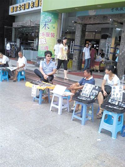 13日下午2點,記者來到南坪西路看到,在西計大廈門口有幾個收售二手手機的小販坐在那里,都在劃定的區(qū)域內擺攤。西計大廈門口有一名身穿城管制服的隊員一直來回巡邏,當有小販將收售手機的紙牌亮出來的時候,城管立即上前要求他收起來,并且附近大概每兩百米就有一名城管在來回巡邏。