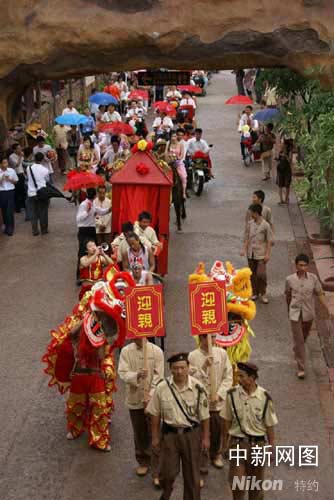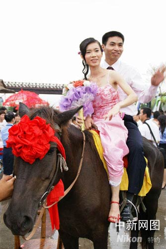 中新網(wǎng)順德9月23日電 (孫建駒 謝俊忠)大鼓擂響,嗩吶聲聲,一支百余米長(zhǎng)的迎親隊(duì)伍中,有高頭大馬、花轎和卡丁車、電瓶車、摩托車、沙灘車、自行車等交通工具,隊(duì)伍熱鬧穿越廣東順德長(zhǎng)鹿農(nóng)莊,28對(duì)新人在這里舉辦別具水鄉(xiāng)特色集體婚禮。