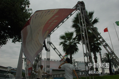 工人在浙江臺(tái)州一國(guó)慶車(chē)展現(xiàn)場(chǎng)加固施工,以應(yīng)對(duì)超強(qiáng)臺(tái)風(fēng)“薔薇”的到來(lái)。作者:陳林聰