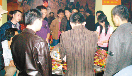 當(dāng)晚8時許,記者為此趕到位于高新區(qū)光華路徐家莊村北口的“電玩世界”進(jìn)行暗訪,走進(jìn)這家電玩娛樂廳,記者發(fā)現(xiàn)不時出入的男男女女,除了少部分人在擺設(shè)的幾臺電玩游戲機前進(jìn)行娛樂外,大多數(shù)人徑直走進(jìn)通入店內(nèi)的一扇小門。記者走進(jìn)那扇小門時,發(fā)現(xiàn)這個百余平方米的“套間”內(nèi)生意異;鸨,6臺大型“動物樂園”游戲賭博機前,圍聚了上百名男女,有觀戰(zhàn)的,有不時“豪爽”掏出50元、100元鈔票投幣、押注的。其中一名手捏一厚沓鈔票的青年男子,連連拿出鈔票投押,約一個小時后,該名男子手里的鈔票一輸而光后起身離開,記者追上佯稱切磋玩技與其攀談時,該男子卻不以為然地說“賭場如戰(zhàn)場,自然有輸有贏”,并稱自己玩賭機現(xiàn)已上癮,一小時輸?shù)羧f余元也很正常。至于“動物樂園”的賭博規(guī)則,當(dāng)然要手里有錢,幾個人可以連機互賭,或單人押分賭注。