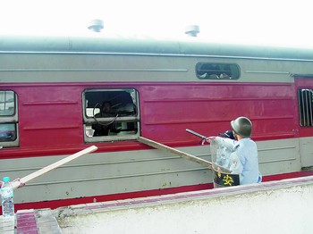 昨日清晨6時(shí)57分,由廣州開往長沙的5362次列車到達(dá)長沙車站,停靠在三站臺五道。長沙車站派出所民警戴戈與列車乘警辦理完交接手續(xù)后,接到該車行李員陽小華報(bào)告,稱當(dāng)日6時(shí)許,該次列車到達(dá)株洲裝卸完行李準(zhǔn)備開車時(shí),突然沖上來一名穿白T恤的中年男子,“撲通”一聲跪倒在他面前,稱有人追殺他。同時(shí),該男子手持深圳至婁底的車票。男子上車后一直躲在行李后,充滿恐懼,經(jīng)行李員多方勸解無果。列車終到長沙車站后,該男子將行李員趕下車廂,將行李車廂的正門反鎖,將通道門用貨物堆碼封閉,并手持一根釘有鐵釘、長1.5米的粗木棒揮舞,不許任何人靠近。