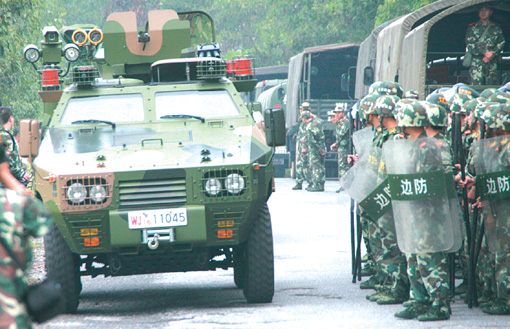 圖為武警裝甲作戰(zhàn)車將警力運送到瓦窯嶺村附近 李君光攝