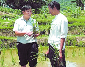 何繼華(左)生前在田里指導農(nóng)民種植水稻。