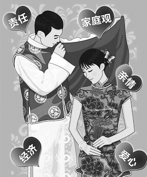 “結(jié)婚生子、白頭偕老的婚姻觀依然占主導(dǎo)地位!毙彀茬髡f(shuō),65.6%的人贊同“不管怎么說(shuō),人總是要結(jié)婚的”,反對(duì)的為15.2%;72%的受訪者贊成“婚姻是神圣的,結(jié)了婚就要白頭到老”,不贊同的僅為6.7%。此外,84.4%的人反對(duì)“結(jié)婚后不要孩子”,對(duì)“丁克”家庭持肯定態(tài)度的僅占1.6%。