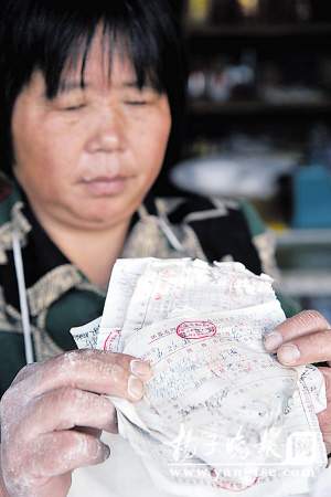 10月13日上午,當記者來到朱湖鎮(zhèn)時,由于沒有掛牌,幾經(jīng)打聽之下才在一個大院內(nèi)找到了鎮(zhèn)政府。在馬路對面,有一排門面房,其中有大部分是賣油米面的門市,只有兩家是出售煙酒等雜貨的小賣部,其中一家已經(jīng)關(guān)門。當記者找到另一家時,才知道這里就是吳長貴開的店,只是他本人不在,吳的妻子在店里包餃子。得知記者是來采訪鎮(zhèn)政府欠債的,吳妻放下手中的餃子皮,來不及擦手,就從柜臺下面摸出了一沓發(fā)票,由于已經(jīng)存放了10年,這些發(fā)票已經(jīng)發(fā)黃、破損,但上面的字跡依然清晰可見!耙还彩嵌f六千塊錢!”老板娘告訴記者。