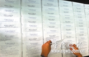 高速公路執(zhí)法隊(duì)員整理“渝B27123”貨車超載處罰通知書的存根