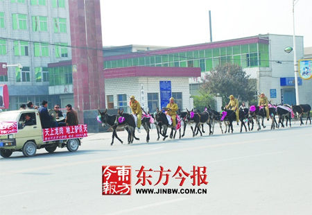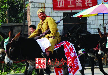 這支“耀武揚(yáng)威”的隊(duì)伍由四名身穿日本帝國主義軍裝、騎著毛驢的男子組成,由于他們牽的毛驢有十多頭,所以隊(duì)伍有二三十米長。在隊(duì)伍前方,一輛面包車上還有一支樂隊(duì),嗩吶聲、镲鈸聲不絕于耳,場面著實(shí)壯觀。