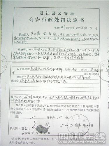 10月21日,在報(bào)請(qǐng)縣人大常委會(huì)批準(zhǔn)之后,縣公安局再次經(jīng)過(guò)局辦公會(huì)研究討論,作出“通公(刑)行決字【2008】第176號(hào)”《行政處罰決定書(shū)》,給予吳正春行政拘留5日的行政處罰!缎姓幜P決定書(shū)》載明的拘留理由是:“2008年10月16日,吳正春用自己的手機(jī)杜撰了一則“七律”詩(shī),短信群發(fā)給幾十名鄉(xiāng)鎮(zhèn)及縣級(jí)有關(guān)機(jī)關(guān)的干部,該短信公然侮辱范申華為‘餓狼’、‘飯囊’,吳正春的行為構(gòu)成侮辱。根據(jù)《中華人民共和國(guó)治安管理處罰法》第四十二條第(二)項(xiàng),決定給予吳正春拘留5日的行政處罰!