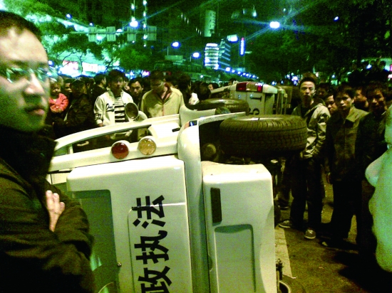 20時(shí)30分,3輛停在路邊的行政執(zhí)法局執(zhí)勤公車成了攤販發(fā)泄的對(duì)象,十余位攤販依次將前兩輛車子掀翻在地,另一輛執(zhí)勤的皮卡車被他們一起推到機(jī)動(dòng)車道上,用來擋住其他車輛通行。