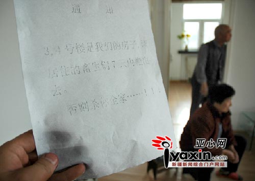 星云房產(chǎn)公司的相關(guān)負(fù)責(zé)人告訴亞心網(wǎng)記者,恐嚇通知并不是他們張貼出去的,烏市株洲路新鑫花園小區(qū)三四號樓的產(chǎn)權(quán)屬于他們,手中也有《商品房預(yù)售許可證》和合法的手續(xù),住戶應(yīng)該盡早搬離。