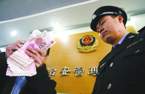昨日,北京治安管理總隊,獲得2萬元獎勵的非法煙花舉報人李先生清點自己的獎金!∮浾 張濤 攝
