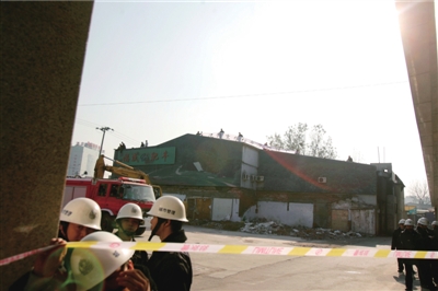 昨天上午8點(diǎn)多,100多名男子列隊(duì)將位于豐臺(tái)路口的“福成肥!憋埖昃o緊包圍。這些人均著統(tǒng)一服裝,部分人頭戴標(biāo)有“城市管理”字樣的白色頭盔,身著深藍(lán)色大衣;部分人全身迷彩服。3輛鏟車(chē)和消防車(chē)也開(kāi)到飯店門(mén)前。拆遷者還用警戒線將飯店圍住。