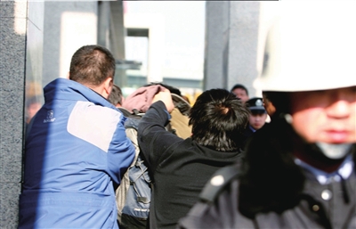 數(shù)名男子圍攻京華時(shí)報(bào)攝影記者夏永(被揪者)。新京報(bào)記者孫純霞攝